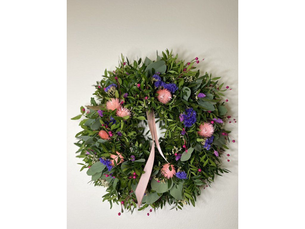 Věnec je tvořen z materiálu, který nepadá a zůstává stejný, pokud je umístěn v interiéru.  Na přímém slunci mění barvu. Barvené stabilizované materiály mohou pouštět barvu.